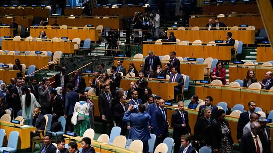 Attendees stage a walkout as Israeli Prime Minister Benjamin Netanyahu (not pictured) delivers his speech at the United Nations General Assembly in New York on Friday. (Bloomberg)